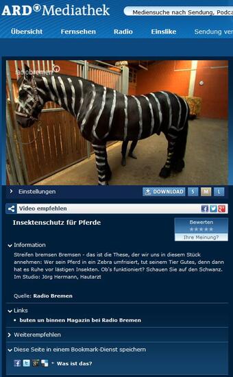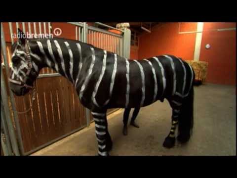 Info: Streifen bremsen Bremsen - das ist die These, der wir uns in diesem Stück annehmen: Wer sein Pferd in ein Zebra umfrisiert, tut seinem Tier Gutes, denn dann hat es Ruhe vor lästigen Insekten. Ob's funktioniert? Schauen Sie auf den Schwanz.