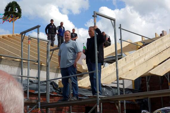 Am Tag vor Himmelfahrt hatten wir bei strahlendem Sonnenschein unser Richtfest, für den Neubau des "Altenteilhauses" - des altengerechten Wohnhauses für Heinz-Hermann, Annegrete und die Berner-Sennenhunde Zucht. Damit Heinz-Hermann nicht mehr mind. 2x täglich von der HagenerStr. in den Weyher Bruch fahren muss. Wir bedanken uns bei den Zimmerleuten/Dachdeckern der Fa. Finke (Weyhe), Maurern der Fa. Kläner (Breddorf), Haustechniker Fa. Schierenbeck (Schwarme), Tiefbau Fa.Hackfeld (Heiligenrode) und Elektriker Fa. Brünjes (Weyhe).