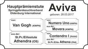 Aviva ist eine Tochter des hoch erfolgreichen Springhengstes Van Gogh. Van Gogh selber gewann u.a. den GCT GP von Valkenswaard, den CSI5* GP von Los Angeles sowie den CSI5* GP des Hong Kong Masters und konnte so mehr als eine Million an Preisgeld gewinnen.